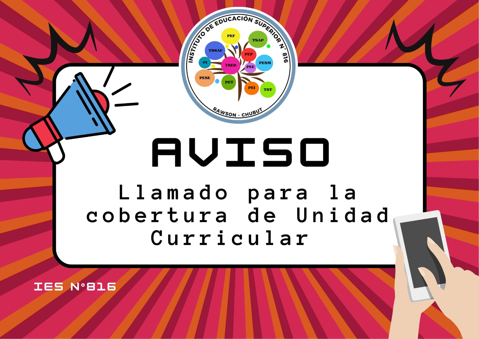 En Rawson a los 21 días del mes de octubre de 2025 la dirección del IES N° 816 hace el llamado abierto y público para la cobertura del siguiente cargo: